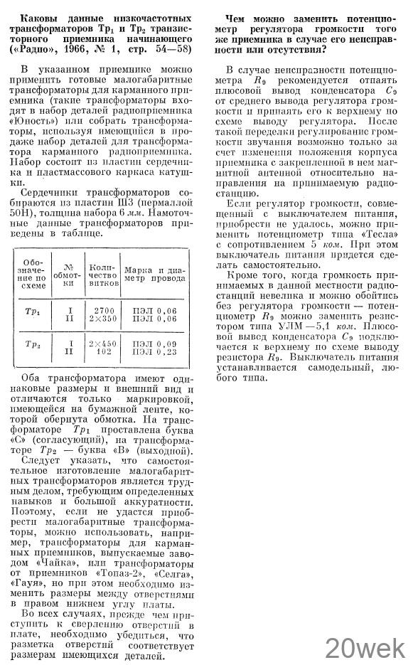 Трансформаторы НЧ (Тр1, Тр2) используются от карманных приемников. Возможно так же самостоятельное изготовление трансформаторов из наборов деталей, выпускаемых специально для любителей.