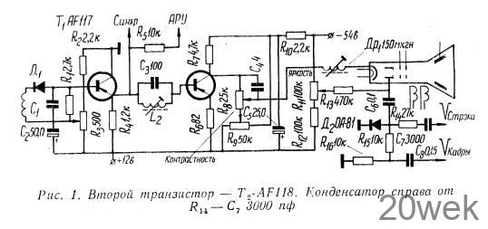 Это напряжение через контур L2C3 фильтра-пробки, настроенной на промежуточную частоту звукового сопровождения, поступает на базу транзистора AF 118 (T2), через сопротивление R5— в систему АРУ и непосредственно — на вход узла синхронизации телевизора. Сопротивление R6 в цепи эмиттера транзистора T2 не шунтировано конденсатором, чтобы избежать появления частотно-зависимой отрицательной обратной связи. В цепи коллектора Т2 находятся сопротивления: нагрузки R7, регулировки контрастности R8 и установки уровня черного R9. Движок переменного сопротивления R8 связан с коллектором Т2 через конденсатор С4 и с катодом кинескопа — через корректирующий дроссель Др1. При повороте этого движка от нижнего (по схеме) положения до верхнего амплитуда сигнала на катоде кинескопа изменяется в 3 раза. Через RC-цепочки C7R14 и С8R15R16 на сетку кинескопа подаются в отрицательной полярности импульсы обратного хода строчной и кадровой разверток. Эти импульсы запирают кинескоп на время обратного хода луча.