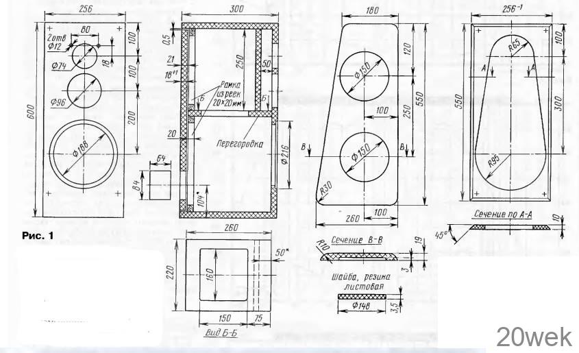 Чертеж корпуса громкоговорителя показан на рис. 1. Корпус имеет полезный объем 28 л для головки НЧ и 2,7 л — для головки СЧ Эти объемы заполнены синтепоном низкой плотности. С целью снижения вибраций внутренняя поверхность корпуса покрыта гидростеклоизолом. Для дополнительного демпфирования боковых стенок использованы накладки. В накладках имеются круглые выборки, в которые вложены резиновые шайбы, по толщине превышающие глубину выборок на 0,5 мм. Накладки прикрепляют к боковым стенкам винтами-саморезами. По мере прижима накладок происходит деформация шайб, и они плотно прилегают к боковой стенке корпуса.