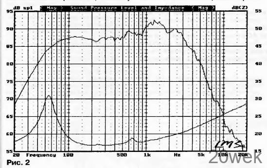 АЧХ головки НЧ (рис. 2) имеет неравномерность 3 дБ в диапазоне частот 60…500 Гц; дальше с увеличением частоты следует подъем с максимумом на частоте 1,3 кГц. Такой характер АЧХ не является проблемой, поскольку в трехполосном громкоговорителе можно использовать головку НЧ в диапазоне частот не выше 600 Гц, где неравномерность АЧХ достаточно мала.