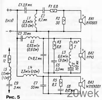 Схема кроссовера показана на рис. 5 Сигналы НЧ поступают на динамическую головку W21EX001 через ФНЧ второго порядка L4C7 обеспечивающий спад АЧХ по звуковому давлению 3 дБ на частоте 500 Гц Цепь R5C8 компенсирует увеличение полного сопротивления головки с ростом частоты Симметричный спад АЧХ головки СЧ формирует ФВЧ первого порядка, в котором работает конденсатор СЗ.