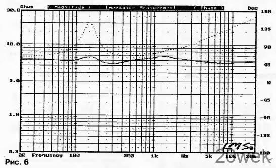 На рис. 9 показана Z-характеристика громкоговорителя. Минимальное значение модуля полного сопротивления громкоговорителя составляет 4,3 Ом на частоте 300 Гц Выше частоты 3 кГц происходит увеличение сопротивления, достигая максимума 18 Ом на частоте 7 кГц. Этот рост полного сопротивления может привести к подчеркнутому воспроизведению высоких частот при работе громкоговорителя с ламповым усилителем, имеющим повышенное выходное сопротивление. Для компенсации подъема параллельно входным клеммам громкоговорителя можно включить последовательный контур R6L5C9 (см. рис. 5). Z-характеристика с компенсацией подъема показана на рис. 10.