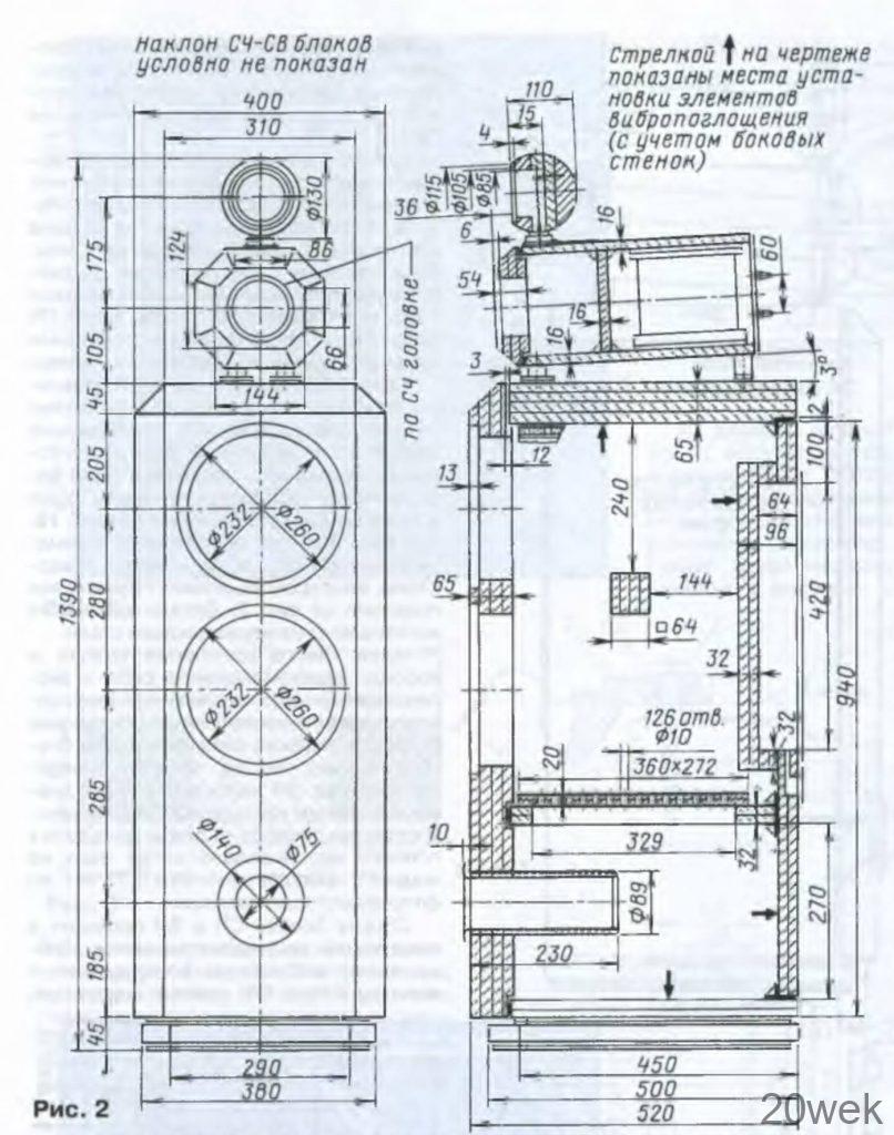 Основной упор при разработке конструкции корпуса для низкочастотных головок ставился на минимизацию резонансных явлений и на снижение уровня вибраций. Вместе с тем при изготовлении АС не использовались редкие и дефицитные материалы и трудоёмкие технологии, связанные с выклейкой криволинейных форм. При повторении конструкции допустимо использовать и близкие аналоги применённых динамических головок, но важно обеспечить требования к форме, вибро- и звукоизоляции корпусов, которые изложены в статье.