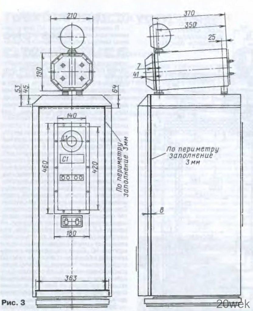 Чертежи конструкции АС представлены на рис. 2, 3. Блоки для СЧ- и ВЧ-головок выполнены согласно рекомендациям [1,2] в виде отдельного узла, его угол наклона в вертикальной плоскости связан с расстоянием от места слушателя до АС. В нём легко регулируется сопряжение фазы излучения в области разделения полос НЧ и СЧ смещением этих блоков по глубине относительно передней плоскости корпуса для низкочастотных головок. ВЧ-головка установлена в шарообразном корпусе и установлена на шестигранном корпусе для СЧ-головки. Конструкция крепления блока ВЧ-головки обеспечивает возможность регулирования ее направленности по двум координатам независимо от ориентации блока СЧ-головки.