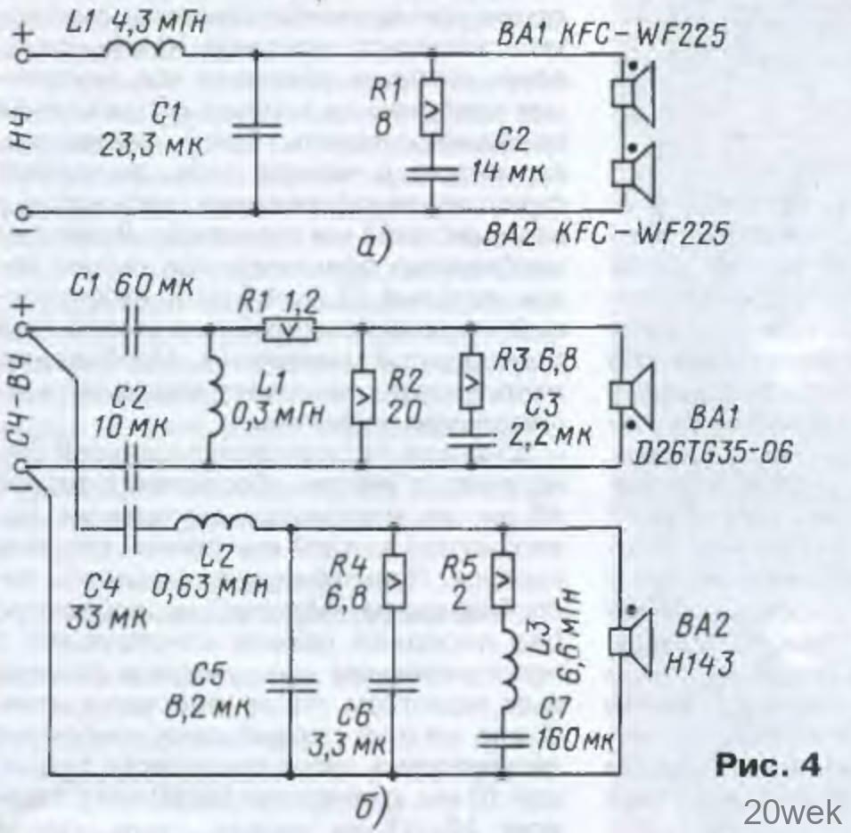 Фильтр для головок НЧ представляет собой ФНЧ второго порядка с частотой разделения 500 Гц, он рассчитан по методике, изложенной в [1]. АЧХ НЧ-головки рассчитана по паспортным данным с помощью программы Win ISD 0,50а7. Схемы фильтров для СЧ- и ВЧ-головок аналогичны описанным в [3, 4]. Схемы узлов кроссовера показаны на рис. 4,а, б.