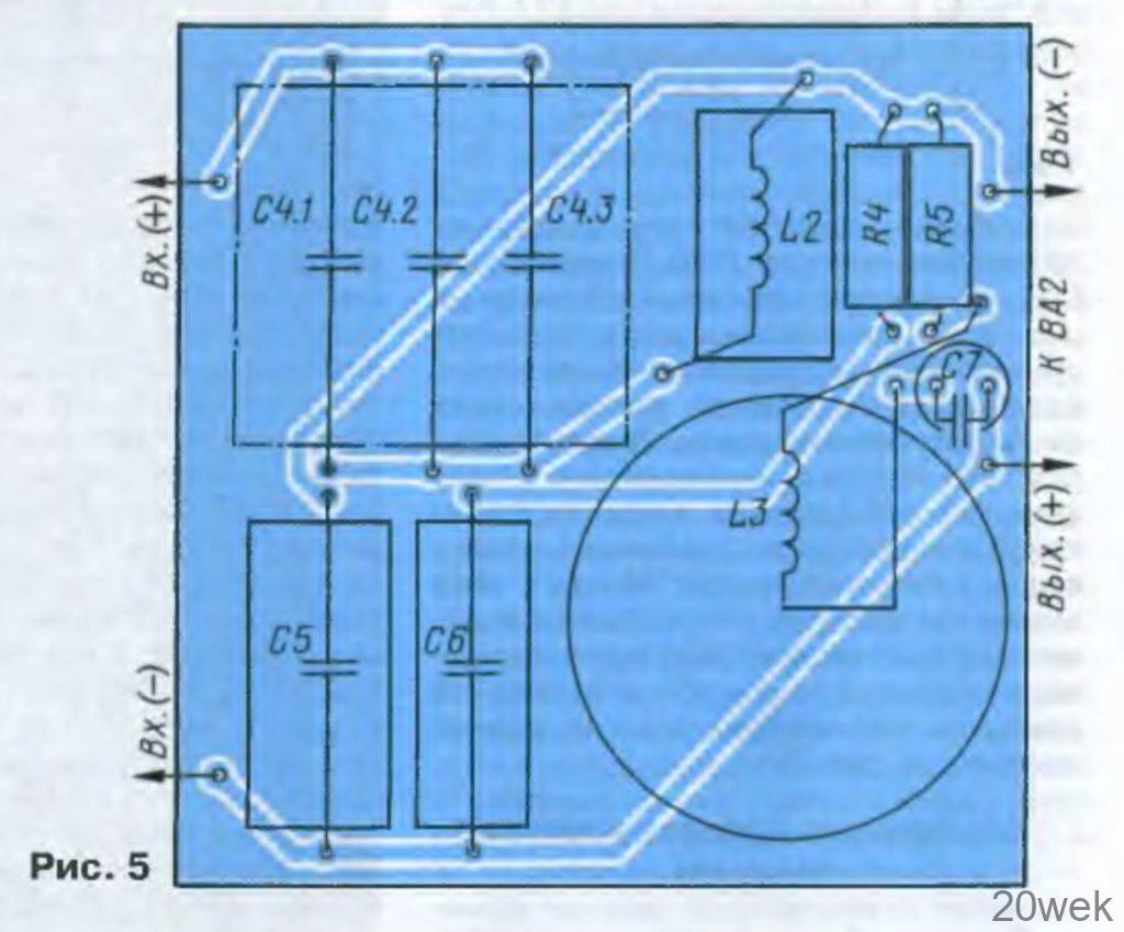 Кроссовер полос СЧ и ВЧ смонтирован на печатных платах размерами 130×127 мм (соответственно рис. 5 и 6), выполненных из фольгированного стеклотекстолита. Конденсаторы в фильтрах — К73-16 на 63 В и МБГО на 160 В, резисторы — С5-5В и С5-16МВ. Соприкасающиеся детали монтажа (конденсаторы К73-16) задемпфированы силиконовым герметиком. Обе платы фильтров этих полос установлены в блоке СЧ и зафиксированы в пластмассовых направляющих, которые приклеены к корпусу через два слоя мягкого линолеума для исключения резонансных явлений.