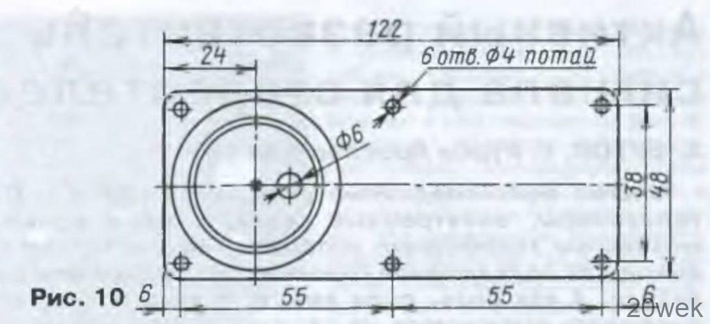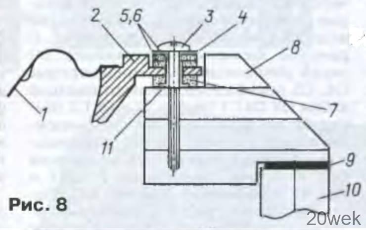 Корпус блока ВЧ (рис. 9) изготавливают на токарном станке из переклейки четырёх слоев древесины во избежание эффекта рассыхания. В данной конструкции применена древесина липы из-за лёгкости обработки и массы. Узел крепления блока ВЧ показан на рис. 10, а на рис. 11 — часть этого узла, цилиндрическая опора, где 1 — винт с отверстием, в котором зацепляют пружину, как показано на рис. 2. Детали крепления изготовлены из нержавеющей стали.
