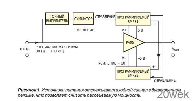 Когда вы включаете в свой проект мощный операционный усилитель, такой как PA05 компании Apex, желательно свести к минимуму разницу между напряжением питания и выходным напряжением, чтобы уменьшить рассеиваемую мощность и полностью использовать выходной диапазон усилителя. Нашей целью была разработка усилителя мощности, обеспечивающего пиковое выходное напряжение 70 В при токе 10 А с фиксированным коэффициентом усиления 10 в полосе частот от 30 Гц до 100 кГц. Чтобы получить размах ±35 В, потребовались источники постоянного напряжения примерно ±38 В и два дополнительных источника ±5 В. Для получения полного выходного тока 10 А при более низком напряжении необходимо уменьшать напряжение питания пропорционально выходному напряжению, чтобы снизить рассеиваемую мощность. В этом случае коэффициент усиления фиксируется на уровне 10. Таким образом, можно поддерживать напряжение питания пропорциональным входному напряжению (Рисунок 1). SMPS1 и SMPS2 — это идентичные источники питания с программируемым выходным напряжением (за исключением вспомогательных источников ±5 В). Высокоточный выпрямитель вырабатывает выходное напряжение, пропорциональное амплитуде входного сигнала. Чтобы в отсутствие входного сигнала получить примерно ±6 В, схема добавляет к сигналу напряжение смещения.