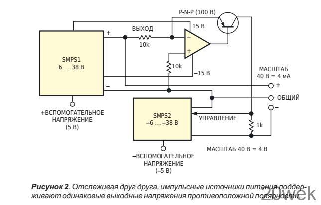 По мере увеличения входного напряжения выходное напряжение SMPS увеличивается с 6 до 38 В при входном напряжении 7 В пик-пик. Для управления SMPS отрицательной стороны необходимо передавать информацию из SMPS1 в SMPS2. Передачу осуществляет схема на Рисунке 2, которая вырабатывает ток, пропорциональный входному напряжению.