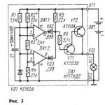 Узел автоматической регулировки уровня состоит из выпрямителя на диодах V4 и V5, выполненного по схеме удвоения, усилителя постоянного тока на транзисторе V7 и регулирующего транзистора V6. Как только по какимнибудь причинам напряжение на выходе генератора изменится, например повысится, то возрастет смещение на базе транзистора V7. Это, в свою очередь, приведет к уменьшению тока через транзистор V6 (следовательно, и через транзисторы генератора V1, V2), и напряжение на выходе генератора уменьшится до первоначального значения.