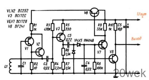Генератор, схема которого приведена на рисунке, предназначен для измерительной аппаратуры. Важным преимуществом этого генератора является возможность использовать резонансные контуры практически с любым отношением L/C. Так, он одинаково устойчиво работает, если индуктивность катушки L1 изменяется в пределах от 50 мкГн до 100 мГн, а емкость конденсатора С1 — от 50 пФ до 5 мкФ. Например, при индуктивности L1 — 50 мкГ и емкости С1 — 5 мкФ генерируемая частота будет около 10 кГц, а при той же индуктивности и С1 = 50 пФ — 3,2 МГц. Кроме того, к числу достоинств данного генератора следует отнести малое напряжение на LC-контуре — примерно 100 мВ. В некоторых случаях это существенно, например, при измерении параметров варикапов. Генератор выполнен на транзисторах V1 и V2. Каскад на транзисторе V3 — предварительный усилитель, сигнал с которого поступает на выходной усилитель (транзистор V8) и на узел автоматической регулировки уровня выходного сигнала генератора. Поскольку на предварительный усилитель сигнал поступает непосредственно с колебательного контура генератора, то узел АРУ поддерживает постоянным напряжение и на этом контуре.