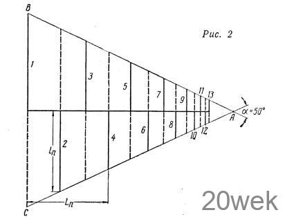 Схематический чертеж деревянной опоры, на которой крепится кабель, изображен на рис. 2. Сплошными линиями показаны поперечные рейки верхней структуры, пунктирными — нижней. При построении антенны используется методика, описанная в журнале «Радио» № 8, 1960 г., стр. 42. Основание ВС равнобедренного треугольника АВС равно