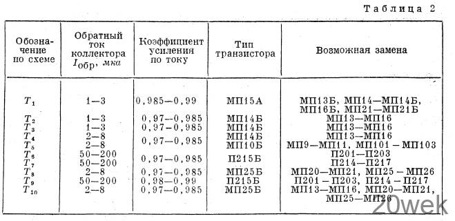 Конденсаторы и резисторы могут быть любого типа с отклонением от номинала ±20%. Транзисторы для усилителя необходимо отобрать согласно табл. 2.