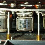 С сопротивления R4 сигнал последовательно поступает на транзисторы Т2 и Т3. Оба каскада охвачены глубокой отрицательной обратной связью, они дают стабильное, независящее от разброса параметров транзисторов усиление, равное 100. Каскады, выполненные на транзисторах Т4 и Т5, также охвачены отрицательной обратной связью, величина которой зависит от частоты и создает необходимую коррекцию в режиме записи и воспроизведения. Выходной каскад усилителя собран по схеме эмиттерного повторителя на транзисторе T6. Он обеспечивает в режиме записи на нагрузке, равной 1,8 ком, напряжение порядка 2 в.