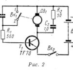 В режиме воспроизведения сигнал от магнитной головки поступает на базу транзистора Т1 типа П15, включенного по схеме эмиттерного повторителя. Подробный расчет такого каскада был опубликован в журнале «Радио», № 10 за 1964 г.