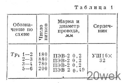 Силовой трансформатор самодельный, сердечник использовался от выходного трансформатора магнитофона «Яуза-5». Намоточные данные его приведены в табл. 1. Переключателем сети служит тумблер на два положения.