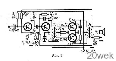 Усилитель, схема которого приведена на рис. 6 трехкаскадный. Оконечный каскад — двухтактный, с выходным и согласующим трансформаторами. Выходная мощность — 100—150 мВт. Все транзисторы — типа П13 с коэффициентом усиления В=9—16. Без обратных связей входное сопротивление усилителя составляет 500—700 ом, а чувствительность со входа 18—20 мв. Выход усилителя рассчитан на динамический громкоговоритель 0,1ГД-6 с сопротивлением звуковой катушки 10 ом. Для повышения усиления применена положительная обратная связь по току, напряжение которой снимается с сопротивления R10 и подается на базу транзистора Т2. Входное сопротивление, транзистора Т2 в результате этого повышается, так как напряжение обратной связи подается на базу параллельно с напряжением сигнала, а выходное сопротивление всего усилителя снижается. Однако, каскады усилителя, охваченные положительной обратной связью работают неустойчиво, поэтому в усилитель дополнительно введена отрицательная обратная связь, напряжение которой со вторичной обмотки трансформатора Тр2 подается в цепь эмиттера транзистора T1 через делитель R3—R4. Глубина отрицательной обратной связи выбирается такой, чтобы чувствительность, а значит и устойчивость усилителя оставались теми же, что и без обратных связей. Входное сопротивление при этом удается повысить до 6—8 ком.