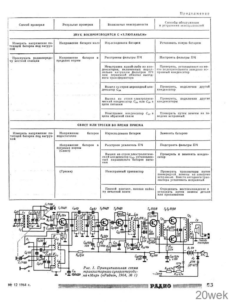 В таблицах приведены наиболее часто встречающиеся характерные неисправности транзисторных приемников. Таблицы составлены применительно к промышленному транзисторному супергетеродину «Мир». Принципиальная схема этого приемника изображена на рис. 1. Так как схемы различных транзисторных супергетеродинов сравнительно мало отличаются друг от друга, таблицами можно руководствоваться и при определении неисправностей в других приемниках.