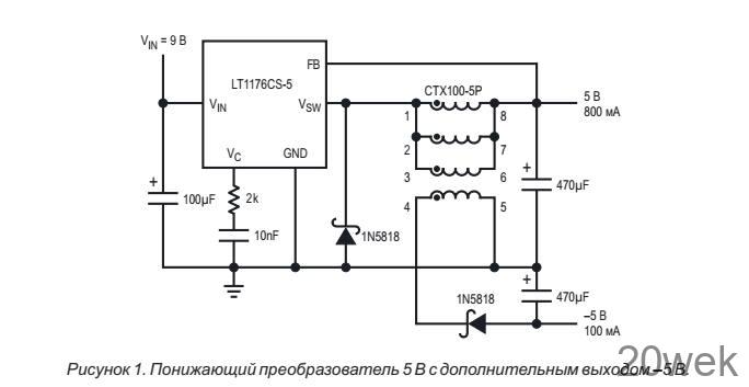 Схема, показанная на Рисунке 1, удовлетворяет требованию заказчика о создании преобразователя напряжения от 9 В до 12 В в выходные напряжения 5 В/800 мА и -5 В/100 мА. Для получения выходного напряжения -5 В в этом преобразователе, похожем на понижающий, используется двухобмоточный дроссель с соотношением витков 1:1. Оптимальным решением была бы катушка с бифилярной намоткой проводом большого сечения для основного выхода 5 В и проводом меньшего сечения для -5 В. Чтобы не создавать собственную катушку, используется готовый дроссель с квадрифилярной обмоткой. Это семейство катушек состоит из четырех секций с соотношением витков 1:1:1:1. В приложении на Рисунке 1 три секции включены параллельно в качестве основной обмотки 5 В, а оставшаяся секция используется для выхода -5 В. Это позволяет сконцентрировать медь там, где она больше всего нужна — на сильноточном выходе.