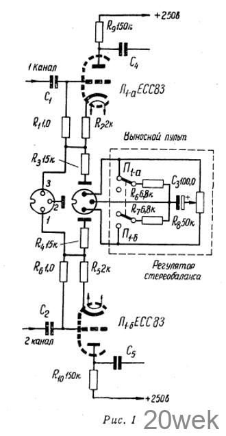 При прослушивании стереофонических записей необходима точная установка равенства громкостей звука в обоих каналах. Превышение громкости одного из каналов создает впечатление пространственного смещения звука в сторону этого канала. Наиболее удобен выносной регулятор стереобаланса. Пользуясь им, можно точно установить необходимый стереобаланс во время воспроизведения испытательной грампластинки, находясь на месте постоянного прослушивания. Схема выносного пульта регулятора стереобаланса показана на рис. 1 (дополнительный сдвоенный переключатель служит для скачкообразного изменения громкости). Этот регулятор работает следующим образом. В катодных цепях ламп каскадов предварительного усиления обоих каналов установлены большие не зашунтированные конденсаторами сопротивления Rз и R4, что Приводит К возникновению глубокой отрицательной обратной связи по току, значительно снижающей усиление. Через соответствующие гнезда разъема сопротивления Rз и R4 соединены с концами потенциометра R8 регулятора стереобаланса. Движок регулятора заземлен по переменному току через конденсатор большой емкости Сз. При перемещении движка потенциометра вверх или вниз (по схеме), соответственно одно из сопротивлений Rз или R4 окажется зашунтированным конденсатором Сз в большей степени, чем другое, и поэтому усиление одного каскада увеличится, а другого — уменьшится. Указанные на схеме величины деталей обеспечивают достаточную для практики глубину регулировки стереобаланса.