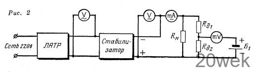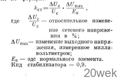 Изменяя напряжение на входе стабилизатора, замечают показания вольтметра, подключенного к выходу стабилизатора. При этом показания вольтметра не должны изменяться Смещение или дрожание стрелки вольтметра свидетельствует о недостаточном коэффициенте стабилизации или же о самовозбуждении, что устраняется подбором емкости конденсатора С5. Чрезмерное увеличение емкости этого конденсатора нежелательно. Коэффициент стабилизации можно измерить, воспользовавшись схемой, показанной на рис. 2 и применив нормальный элемент в качестве образцовой меры. Здесь к выходу стабилизатора подключается делитель напряжения, сопротивление одного плеча которого Rd2 лежит в пределах 100—1000 ом. На резисторе Rd2 устанавливают напряжение, равное 1 в. Полярность нормального элемента должна быть обратной по сравнению с полярностью напряжения на Rd2. Разность этих напряжений измеряют фотокомпенсационным милливольтметром типа ФИ6/2 или же высокоомным гальванометром. Коэффициент стабилизации напряжения сети определяется по формуле: