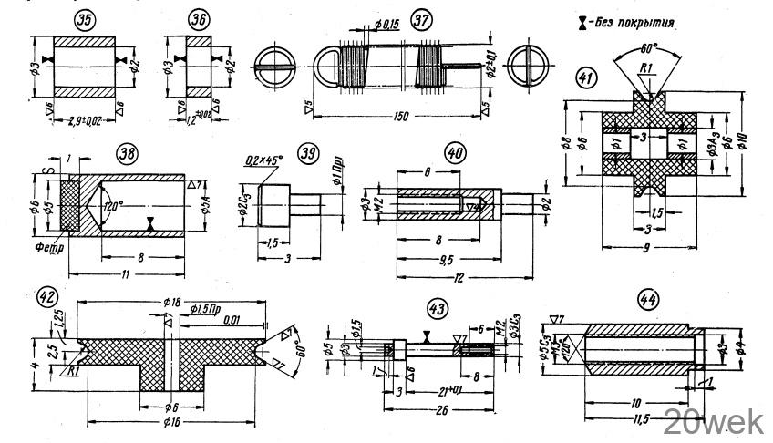 Подкассетник собирается из деталей, показанных на 3-й странице вкладки. В ступицу 21 запрессовывают втулку 22, развертывают ее и подгоняют по оси 43. К ступице приклепывают шестерню 20 шестью алюминиевыми заклепками диаметром 1 мм. Зубья шестерни желательно нарезать после сборки деталей 20, 21, 22. В два отверстия ступицы, расположенные по диаметру 19 мм, вставляют штифты 23, а в два других вклепывают пружинную шайбу 25, которая прижимает штифты к ступице