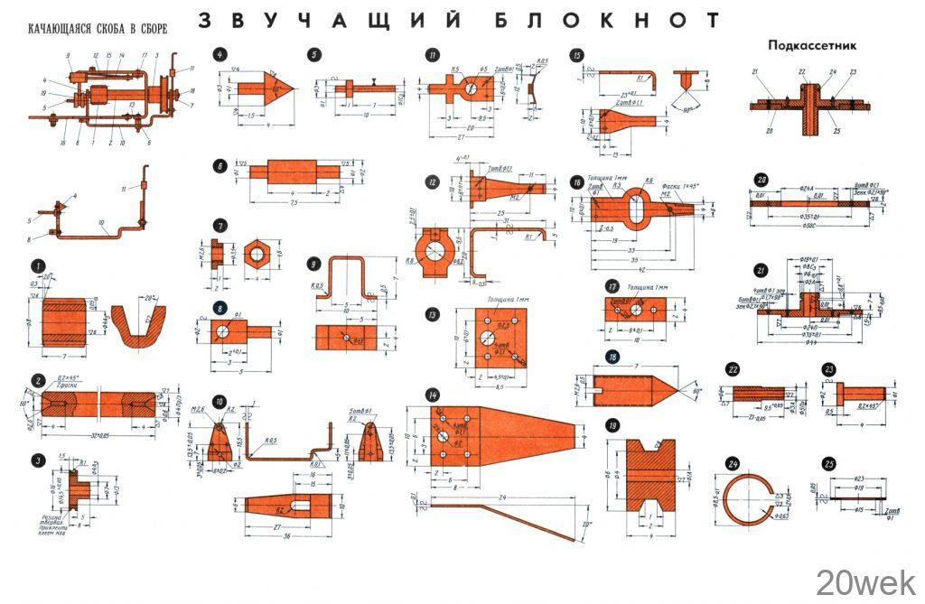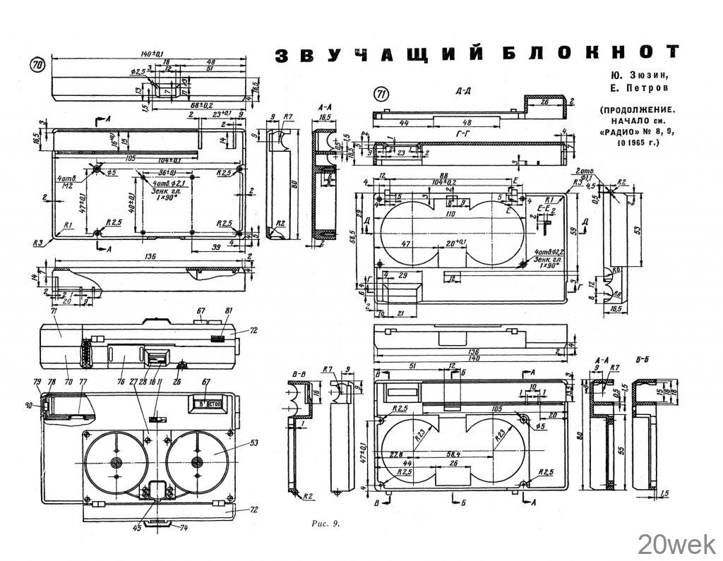 Основные технические данные. Магнитофон «Блокнот» представляет собой миниатюрный звукозаписывающий и звуковоспроизводящий аппарат с автономным электропитанием. Относительно небольшой вес и малые габариты позволяют удобно носить его в карманах пиджака. Записать речь на магнитофон можно с помощью выносного микрофона, роль которого с успехом выполняет телефонный наушник типа ТА-56. Тот же телефон можно использовать и для прослушивания сделанных записей.