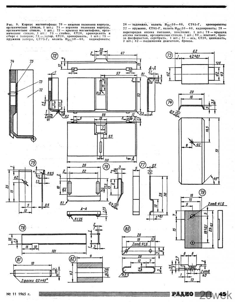 На основание 26 (см. 2-ю и 3-ю страницы вкладки «Радио» № 8, 1965 г.) лентопротяжного механизма следует вклепать детали, показанные на рис. 1: ось 39, на которой будет установлена скоба 10 с червячным винтом 1, стойки 40 для крепления усилителя, оси 43 для установки подкассетников и стойки 44 для втулок 38 с подтормаживающими фильцами. Экран приклепывают к основанию 26 стальными заклепками диаметром 1 мм с потайной головкой. Головку заклепки вставляют с внутренней стороны экрана. В крышку механизма 27 в отверстие диаметром 1 мм запрессовывают длинным концом ось 33. К передней части крышки 27 винтами М2Х5 с потайной головкой через шайбы 34 привертывают направляющие стойки 32.