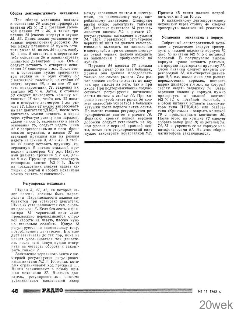 Лентопротяжный механизм. Кинематическая схема магнитофона «Блокнот» показана на вкладке. Его лентопротяжный механизм приводится в движение электродвигателем 2 типа ДКС-7 без центробежного, регулятора. Число оборотов двигателя 2500 об/мин при мощности на валу около 0,2 вт. Для уменьшения электромагнитных наводок на универсальную головку и усилитель, двигатель заключен в экран 1 из электротехнической стали «армко». Между двигателем и экраном проложена амортизирующая прокладка 31. Вращение двигателя 2 через резиновый пассик З и шкивы 29 и 16 передается на червячный винт 18. В зависимости от направления движения ленты 24 винт сцепляется с правой 6 или левой 4 пластмассовыми шестернями, на одной оси с которыми установлены соответственно правая 28 и левая 27 кассеты магнитофона. Обе шестерни подтормаживаются фильцами 7 для натяжения ленты. Линейная скорость движения ленты изменяется в зависимости от диаметра рулона ленты на ведущей кассете. Вал 17 с червячным винтом 18 установлен на оси перекидывающегося кронштейна 15. При перебрасывании винта 18 с одной шестерни на другую магнитная головка 26 с помощью шагового устройства 8, 9, 10, 11, 22 перемещается сверху вниз с одной дорожки на другую. Концы ленты постоянно закреплены на кассетах. В момент реверса рычаг 22 под действием пружины 12 соскальзывает с одной планки 8 (первая дорожка) на другую 10 (вторая дорожка). Вслед за рычагом поддействием той же пружины по направляющим стойкам 13, 14 опускается и головка. При следующем реверсе весь процесс повторяется до тех пор, пока не закончится последняя, четвертая дорожка и автостоп, состоящий из разрывных контактов, не обесточит аппарат. Для повторения фразы или отдельного слова в режиме воспроизведения рычаг 30 нужно перевести в другое крайнее положение. При этом червячный винт 18 выходит из зацепления с шестерней 4 и зацепляется с шестерней 6. Во время перемотки рычаг 30 ставят в нейтральное положение и фиксируют рукой в специальном пазу. В этом случае червячный винт выходит из зацепления с обеими шестернями, и кассеты с лентой можно вращать в любом направлении